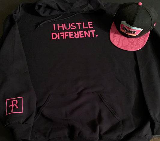 Black With Neon Pink I Hustle Different Logo Hoodie